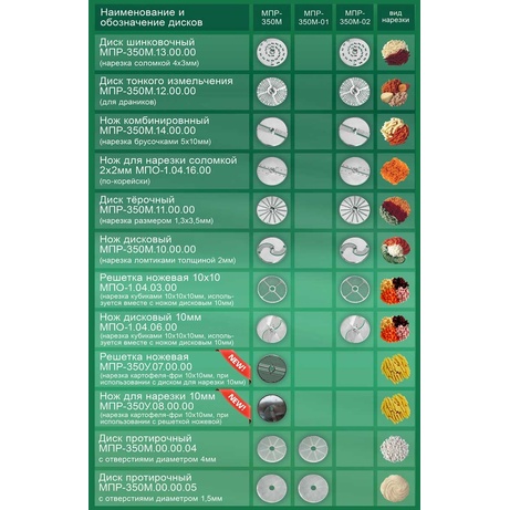 Машина протирочные-резательная МПР-350М-02 с 8 дисками предназначена для нарезки сырых и вареных продуктов (картофеля, свеклы, моркови, лука, огурцов, помидоров и т.д.)